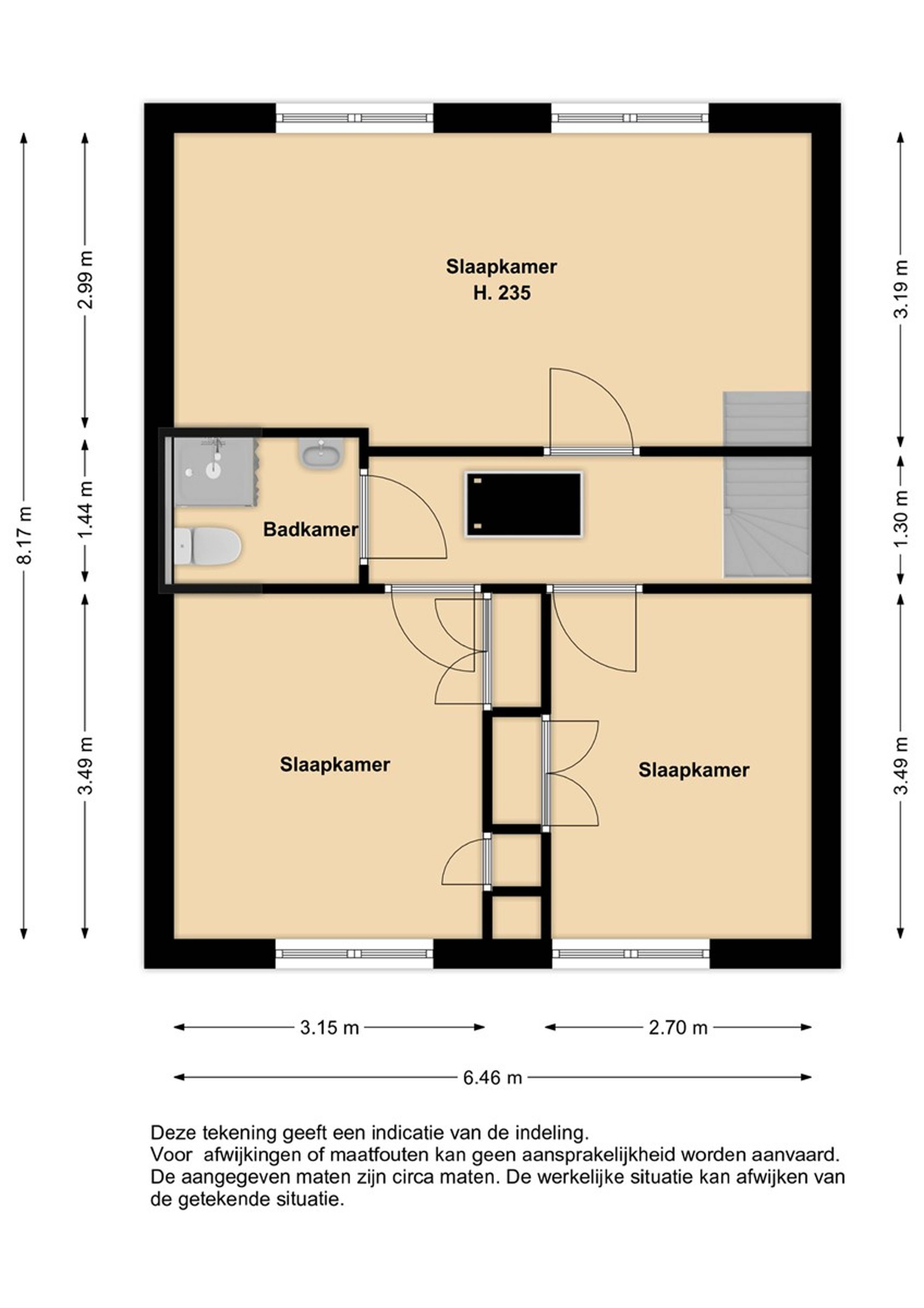 1e verdieping: via de trap in de centrale hal komt u op de 1e verdieping. Op deze verdiepingsvloer zijn een 3-tal slaapkamers aanwezig. Desgewenst kunt u hier ook op eenvoudige wijze de originele 4 slaapkamers weer terugbrengen. Thans zijn namelijk de twee voorste slaapkamers samengevoegd tot één zeer grote slaapkamer. In 2 slaapkamers zijn vaste kastenwanden aanwezig.