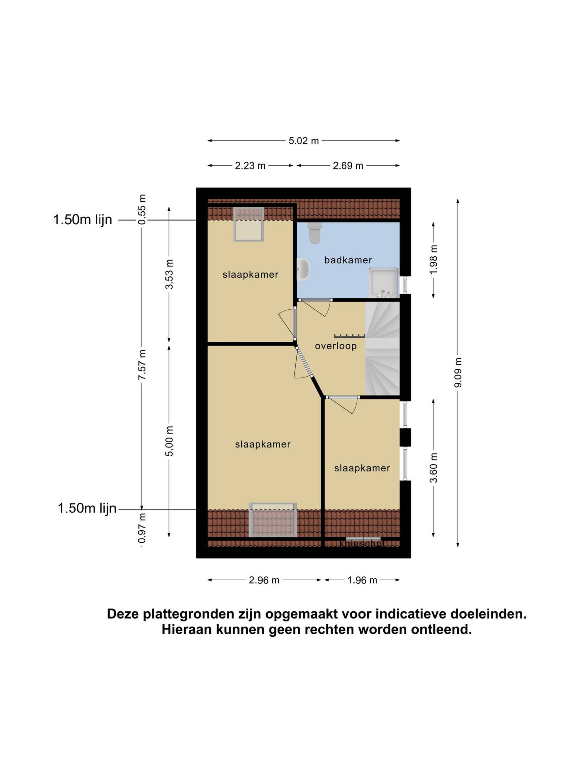 Op de 1e verdieping bevinden zich 3 slaapkamers en de badkamer. De grootste slaapkamer ligt aan de voorzijde van de woning en is voorzien van een dakraam met daaronder een ingebouwd bureau. Aan de zijkant van de woning is een kleine slaapkamer. De tweede kleine slaapkamer met dakraam bevindt zich aan de achterzijde van de woning.