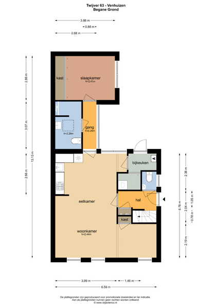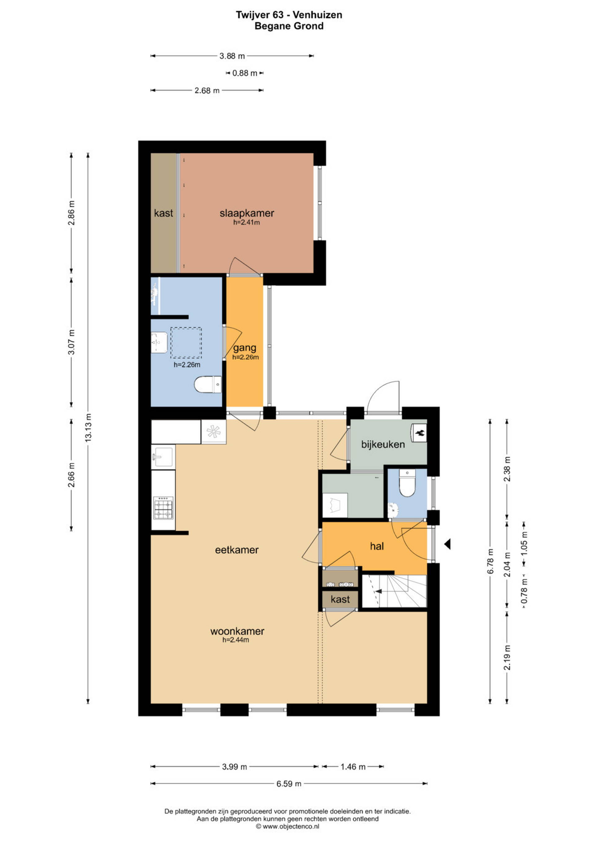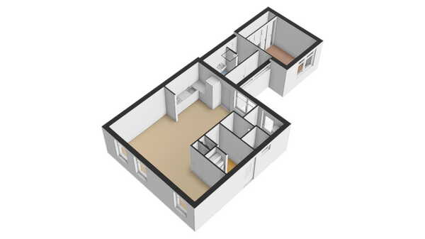 Bij binnenkomst treft u een hal aan met de meterkast, het toilet, de trapopgang naar de bovenverdieping en krijgt u toegang tot de lichte en ruime L vormige woonkamer met open keuken. Aan de achterzijde van de woonkamer treft u de gang die leidt naar de badkamer en de slaapkamer welke gerealiseerd zijn in de aanbouw. De open keuken in warme kleurstelling is voorzien van een inbouwkoelkast, gaskookplaat en een afzuigkap.