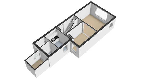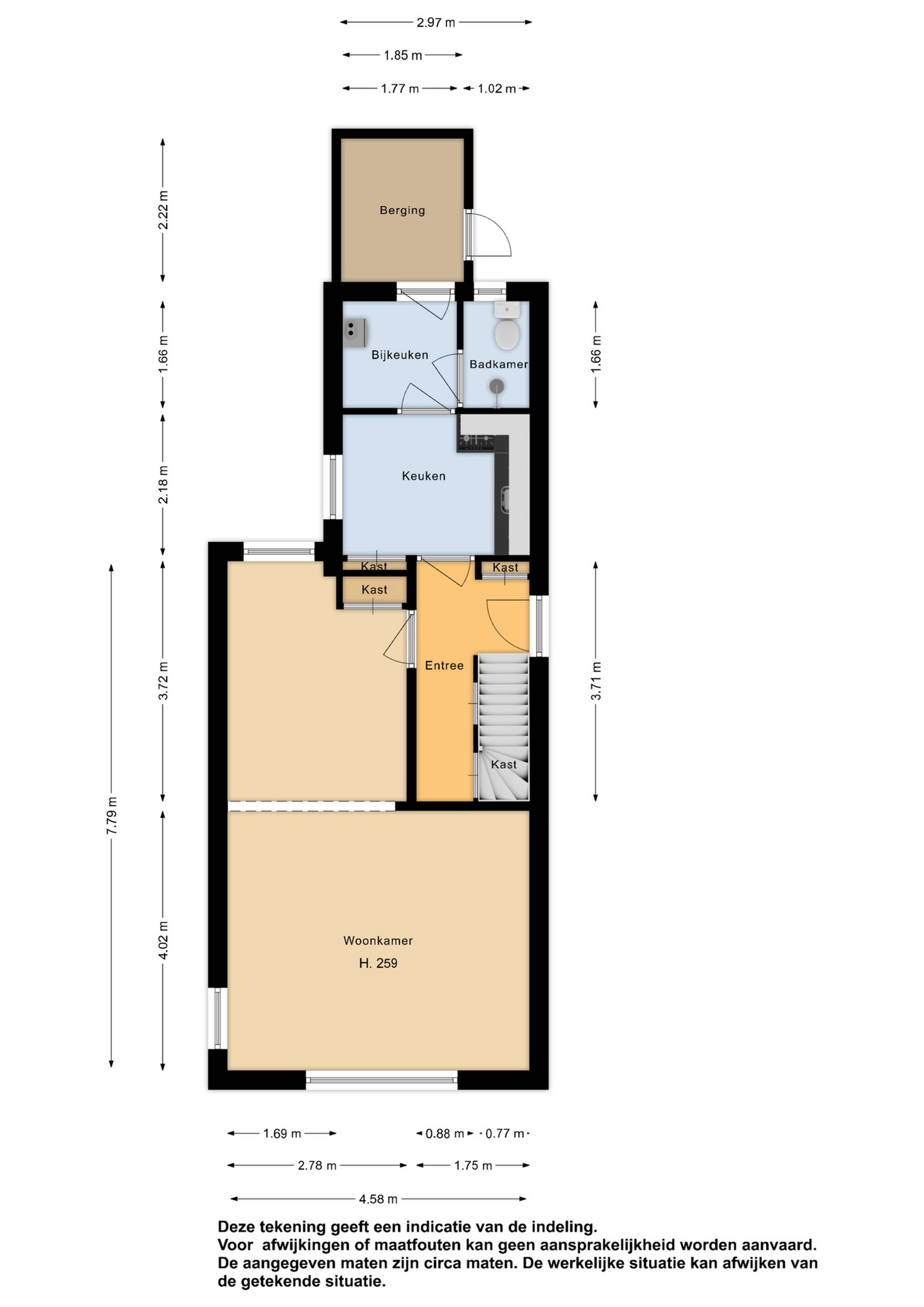 Begane grond: via de zijkant van de woning komt u in de hal met toegang naar woonkamer, keuken, kelderkast en de bovenliggende etage.