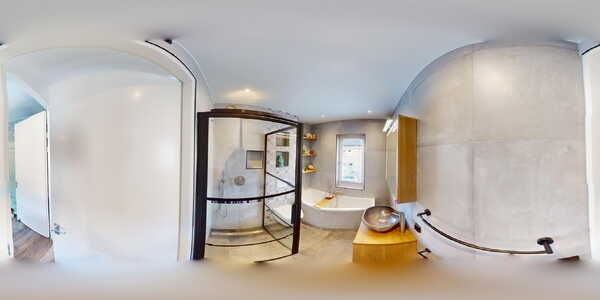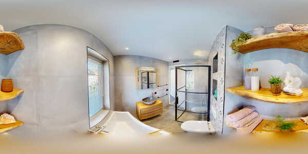 De modern afgewerkte badkamer is volledig betegeld in een moderne kleurstelling. De relaxruimte is fijn voorzien van een 2e toilet, speciaal vormgegeven kunststof ligbad en een wastafelmeubel met granieten wasbak. Uiteraard heeft u ook een ruime douchecabine met drain, stortdouche en handdouche tot uw beschikking. Plezierig is ook het raam dat u heerlijk open kunt doen en geeft ook fijn daglicht in de badkamer. Een fraaie badkamer waar u heerlijk kunt relaxen!